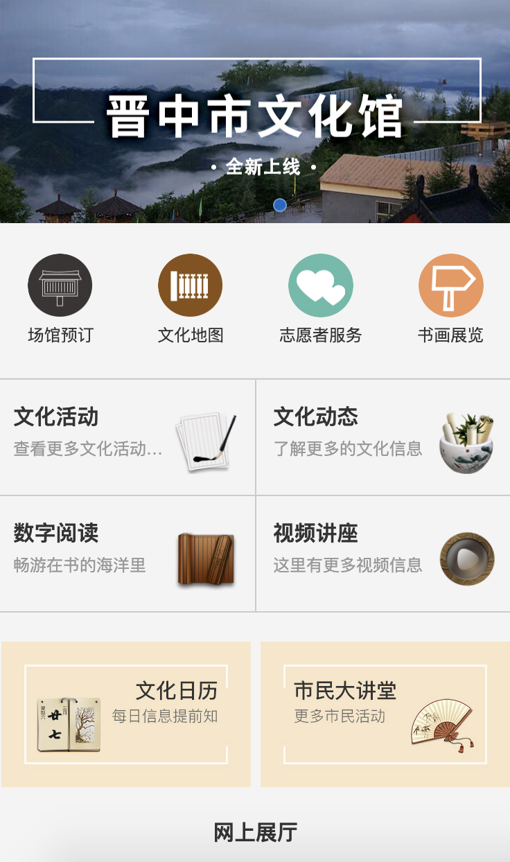 晋中市文化馆是综合晋中市文化动态,活动信息,文化资源及文化服务的一站式发布平台,同时具有互动等社交性质的应用平台。具有文化动态,文化活动,数字展馆,数字文化,特色文化等功能。介绍本地特色及资源,精彩内容一目了然。