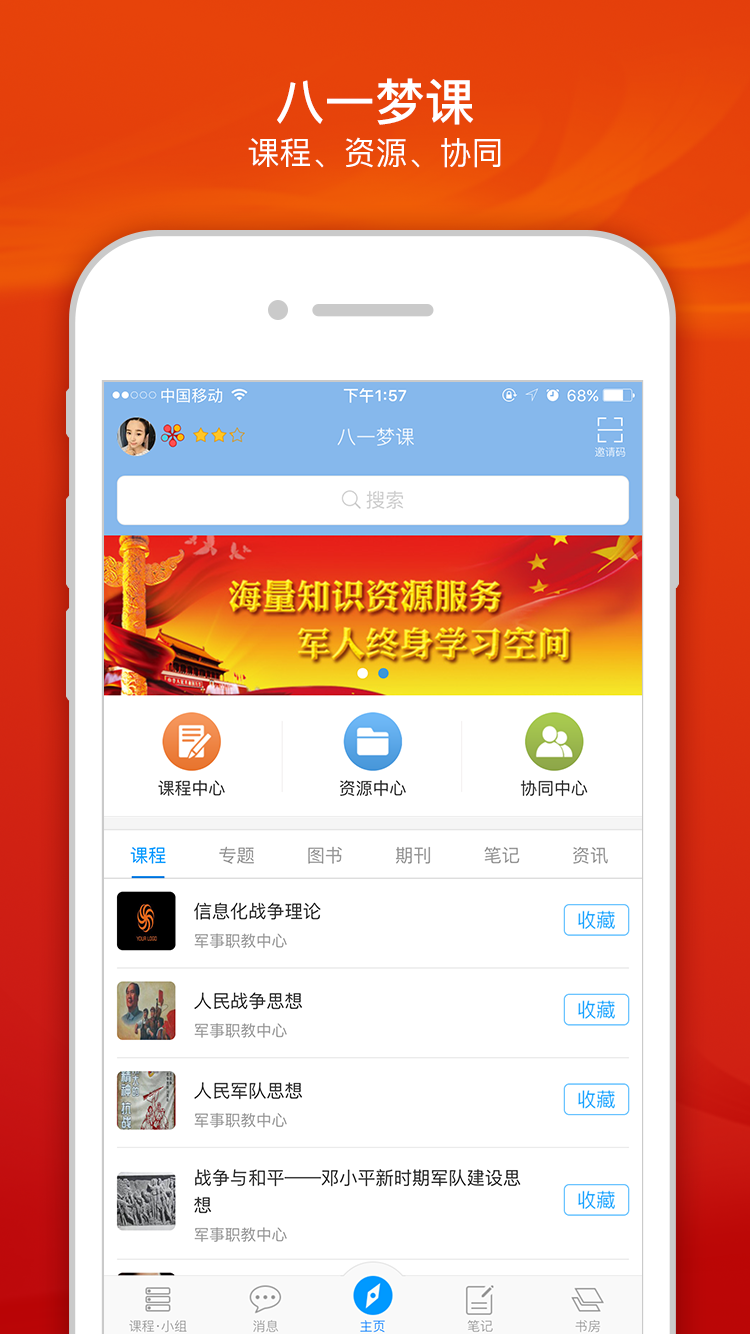 八一梦课是一款为军队系统提供的全民在线教育和学习的移动知识服务平台,平台集课程、资源、协同工作为一体,为学习者提供权威的军职、通识、学历和职教等教育课程,提供包含军事资源、图书、期刊、专题、报纸等在内的海量信息知识资源,打造军人终身学习空间…