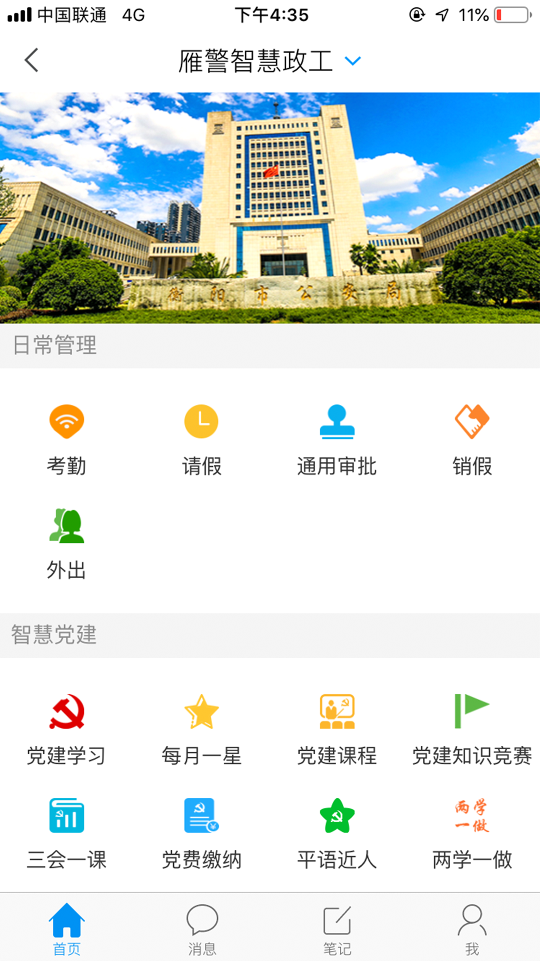 雁警智慧政工APP为警务人员提供考勤、请假、审批等日常管理功能,提供党建课程、党建知识竞赛等党建相关的内容学习测评,还提供生日提醒、福利超市、心理健康等暖警工程。