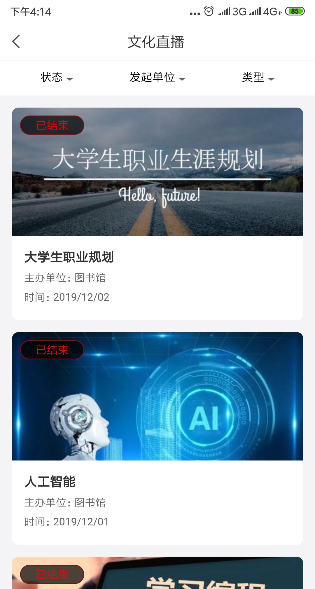 通化云图是综合文化资讯、歌德新书及馆内资源的一站式发布平台,同时具有互动等社交性质的应用平台。具有文化活动、数字展馆、文化直播、自助借还等功能。介绍本地特色及资源,精彩内容一目了然。